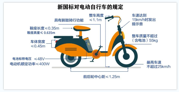 电动自行车整车高度、宽度、前后轮中心距都有明确的数值范围(如下图)。购买前,要认真核对实际数值是否符合规定。