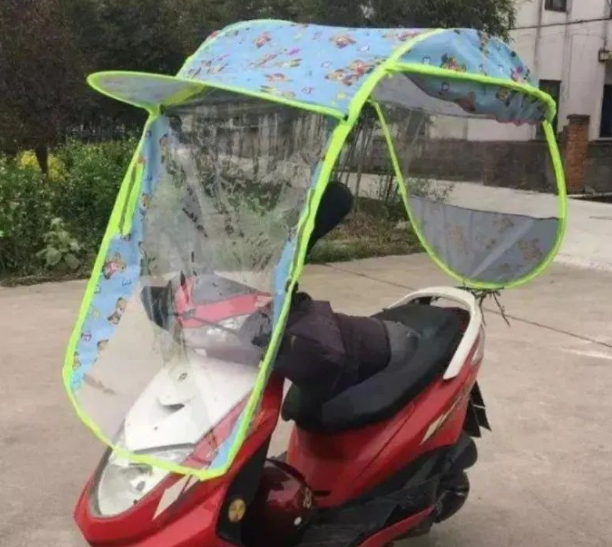 在电动车上加个车篷或遮阳伞虽然遮阳又挡雨,但也会挡住视线,而且还会增加车子的风阻,大风天气里车子容易失去平衡,一不小心就可能出事故。