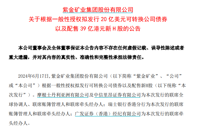 紫金矿业公告显示,紫金矿业、全资子公司金极资本有限公司(以下简称金极资本)与承销商签署认购协议。根据该协议的条款及条件,承销商认购和支付,或促使认购人认购和支付金极资本发行的本金总金额为20亿美元的H股可转债,转股溢价约为28%。