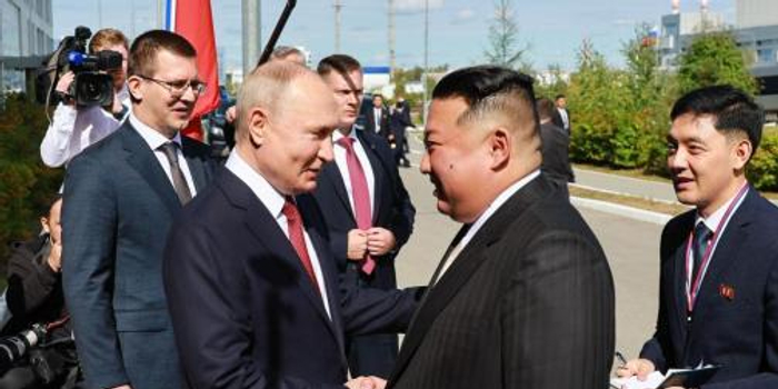 2023年9月13日,在俄罗斯阿穆尔州的东方航天发射场,俄罗斯总统普京与到访的朝鲜最高领导人金正恩举行会晤。