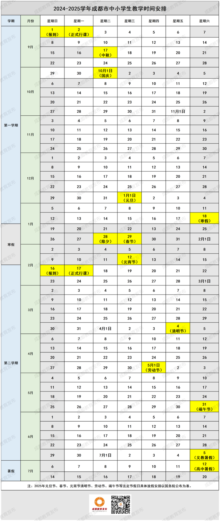2024-2025学年度第一学期:2024年8月31日-9月1日办理入学手续,开展入学教育。9月2日正式行课,2025年1月17日结束,1月18日开始放寒假,实际教育教学共计19周。