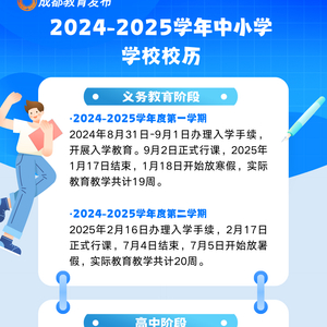 2024-2025学年度第二学期:2025年2月16日办理入学手续,2月17日正式行课,7月11日结束,7月12日开始放暑假,实际教育教学共计21周。
