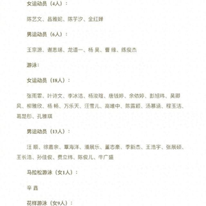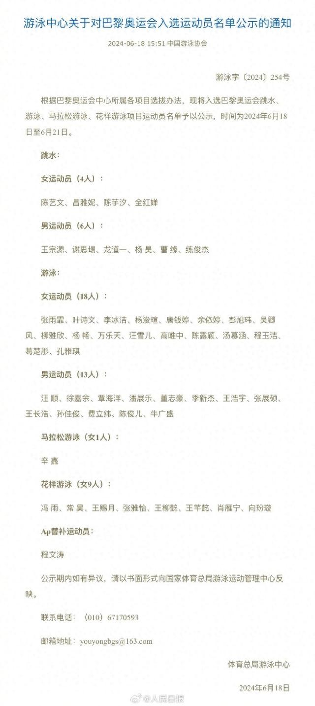 6月18日下午,国家体育总局游泳运动管理中心发布消息,公示入选巴黎奥运会跳水、游泳、马拉松游泳、花样游泳项目运动员名单。