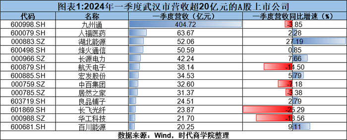 具体来看,一季度武汉市80家A股上市公司中,仅九州通(600998.SH)的营收超过百亿元,达到404.72亿元。2023年年报显示,九州通为科技驱动型的全链医药行业综合服务商,主营业务涵盖医药流通、医药新零售、医药工业、医药CSO等业态。