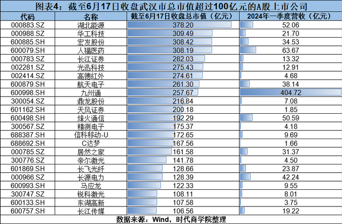 Wind数据显示,截至6月17日收盘,武汉市市值超过百亿元的企业共有23家,占比28.75%。其中,一季度“盈利王”湖北能源以378.20亿元位列第一;华工科技、宏发股份、人福医药分别以309.49亿元、308.42亿元、308.19亿元进入前四名。而除了兴图新科、微创光电、*ST九有和恒立钻具(836942.BJ)外,其余公司的市值均超过10亿元。