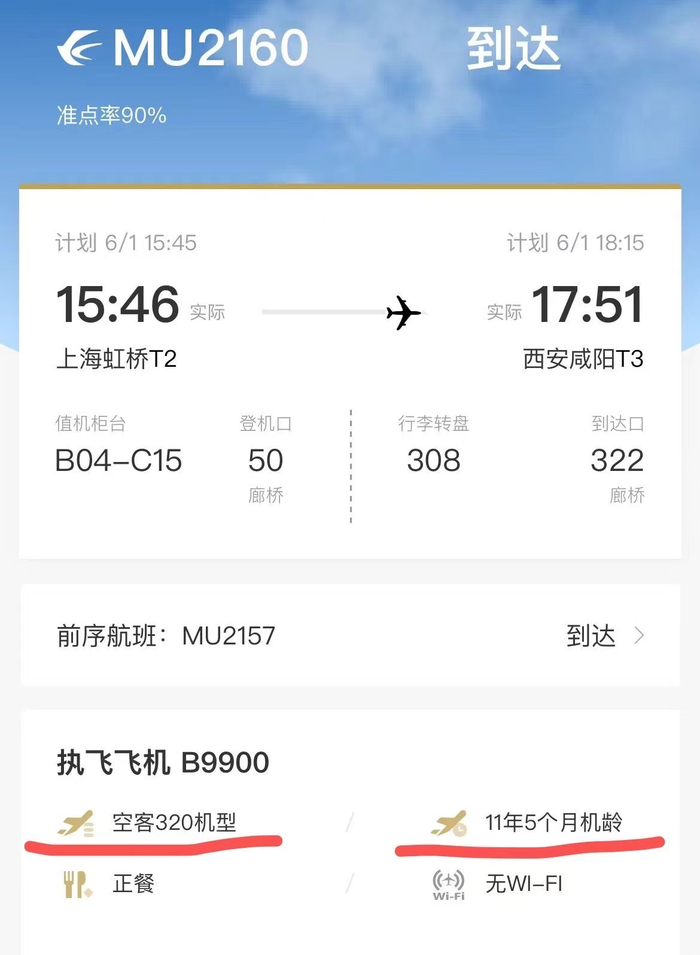 祝先生表示,他订票时也有更为优惠的选择,如当天13点50分吉祥航空A320执飞的航班票价为594元,但他为了体验国产大飞机,选择了票价715元的MU2160,结果却未能如愿,而且实际执飞的这架A320机龄已有11年5个月,感受及舒适度肯定也不如刚投入运行不久的C919。