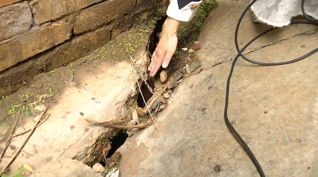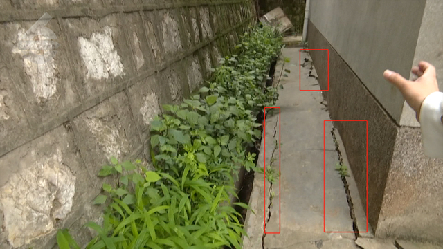 继续往里走,可以看到顺着这个居民楼的墙体沿线都出现了裂缝,而且裂缝的周围有石块已经出现了下沉。