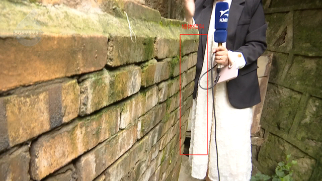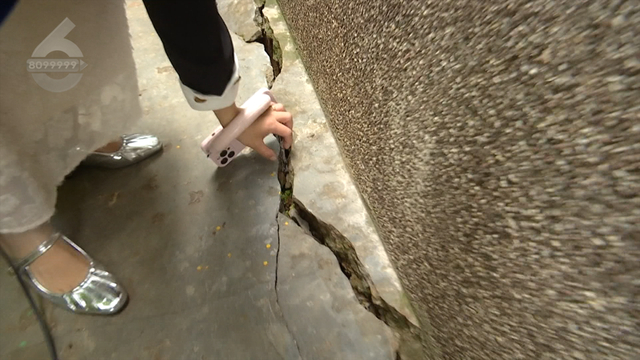 顺着这个墙我们可以往前看到一层住户家的楼下,有一条差不多2米左右(长)的裂缝,这个裂缝的宽度甚至让我们可以看到里面的这些砖块还有水泥,看上去非常的危险。”
