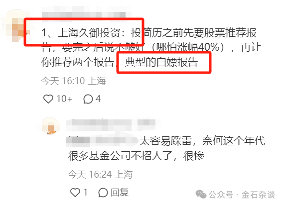 5)上海久御投资:投简历之前先要股票推荐报告,要完之后说不够好(哪怕涨幅40%),再让你推荐两个报告,典型的白嫖报告。金石杂谈查询发现,这家私募规模不足5亿。