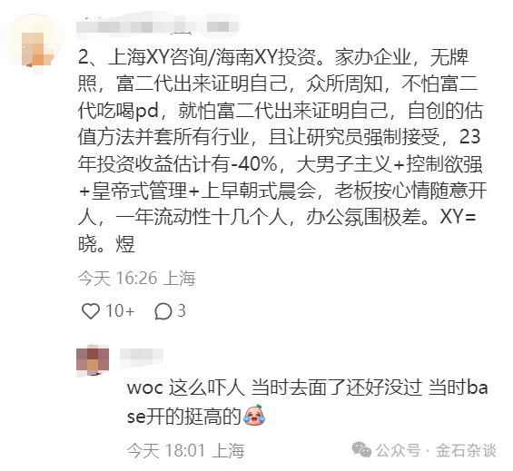 6)上海XY咨询/海南XY投资。家办企业,无牌照,富二代出来证明自己,众所周知,不怕富二代吃喝pd,就怕富二代出来证明自己,自创的估值方法并套所有行业,且让研究员强制接受,23年投资收益估计有-40%,大男子主义+控制欲强+皇帝式管理+上早朝式晨会,老板按心情随意开人,一年流动性十几个人,办公氛围极差。XY=晓煜。