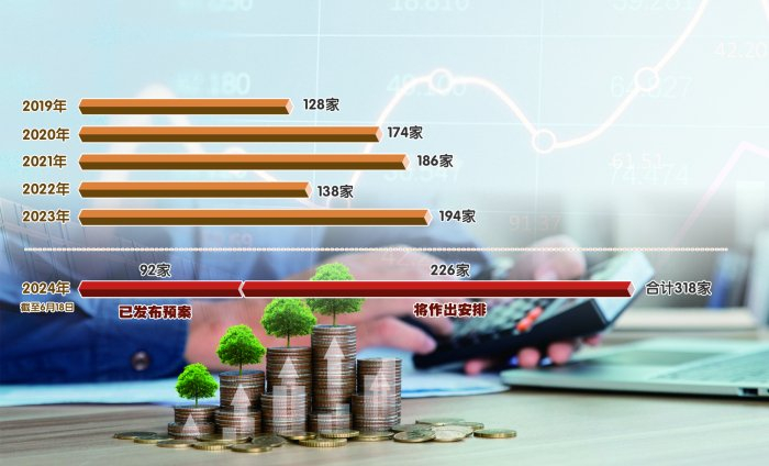 据Wind数据显示,截至6月18日,发布2024年中期分红预案的上市公司已经达到92家;另据记者不完全统计,还有226家表示将对2024年中期分红作出安排,两者合计家数达318家。而2019年至2023年实施中期分红的上市公司分别为128家、174家、186家、138家、194家。