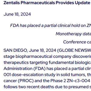 6月18日,Zentalis Pharmaceuticals宣布,FDA已暂停该公司WEE1抑制剂azenosertib的3项临床研究,分别是:治疗实体瘤的I期剂量递增研究(ZN-c3-001),治疗铂耐药卵巢癌(PROC)的II期ZN-c3-005(DENALI)研究以及治疗子宫浆液性癌(USC)的II期ZN-c3-004(TETON)研究。FDA做出这一行动的原因是在DENALI研究中出现两例因疑似败血症而死亡病例。
