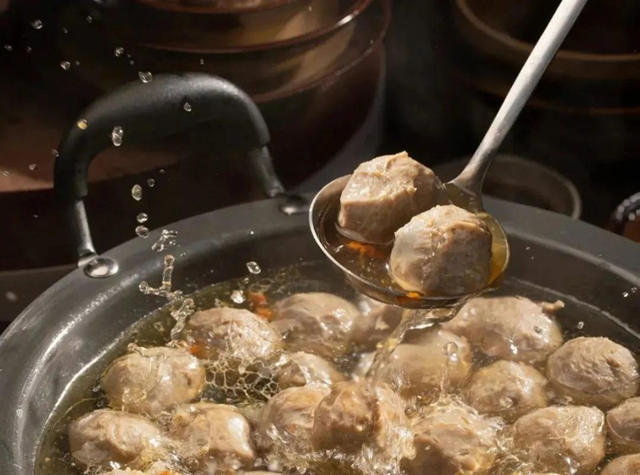 打好的肉浆需要用手挤成丸子,接着用勺子放入温水成型,再经过两次控温控时的煮制