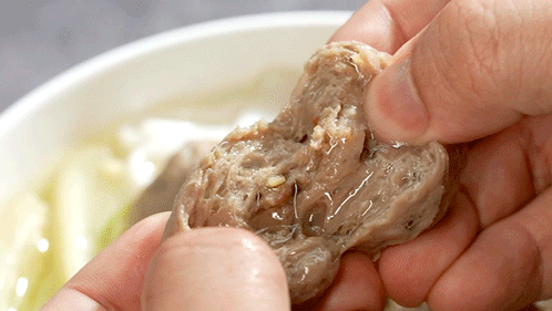 做好后的肉丸非常紧实,但手工捶打也保留了少许牛油,使里面带着空隙,里面盈满了肉汁。