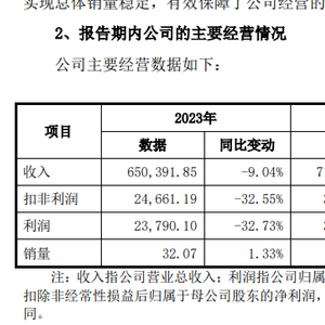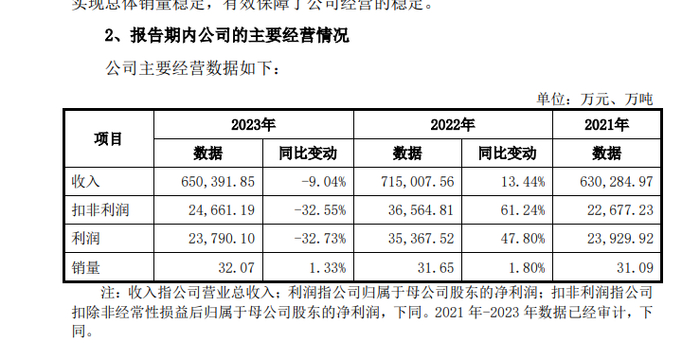 整体来看,2023年永杰新材营业收入65.04亿元,同比下滑9.04%;归母净利润2.38亿元,同比下滑32.73%;扣非净利润2.47亿元,同比下滑32.55%;销量32.07万吨,同比增长1.33%。