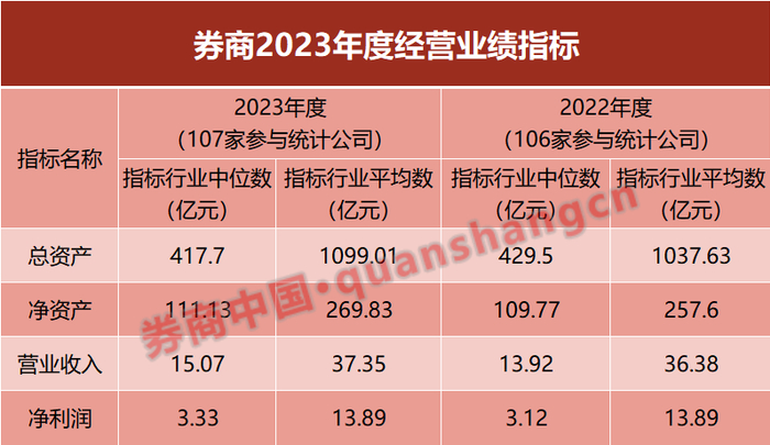 整体来看,2023年度,107家参与统计的证券公司营业收入平均数为37.35亿元、营业收入中位数为15.07亿元;净利润平均数为13.89亿元、净利润中位数为3.33亿元。