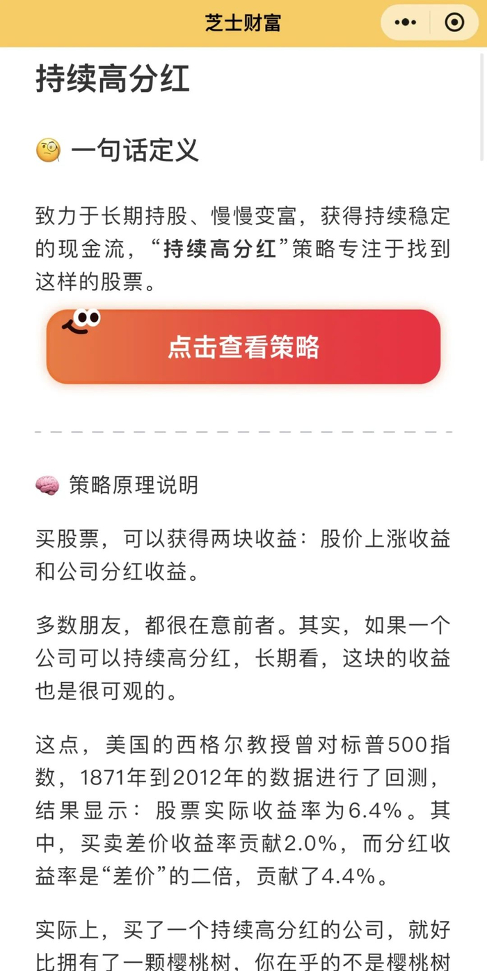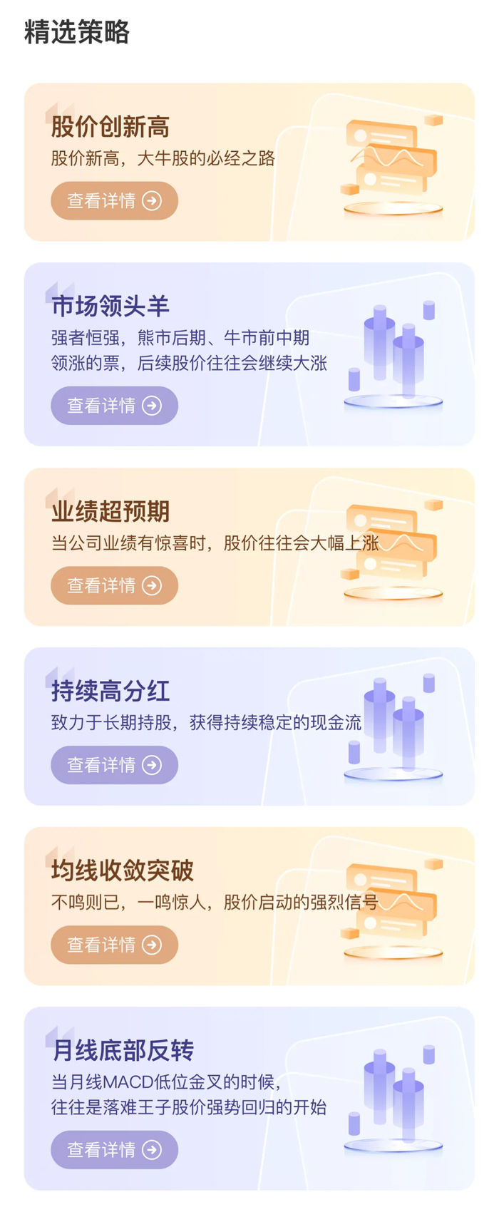 这个还真有:在【选股】页面最下方,有6个精选策略,每一个都有详细的原理、筛选条件、案例说明: