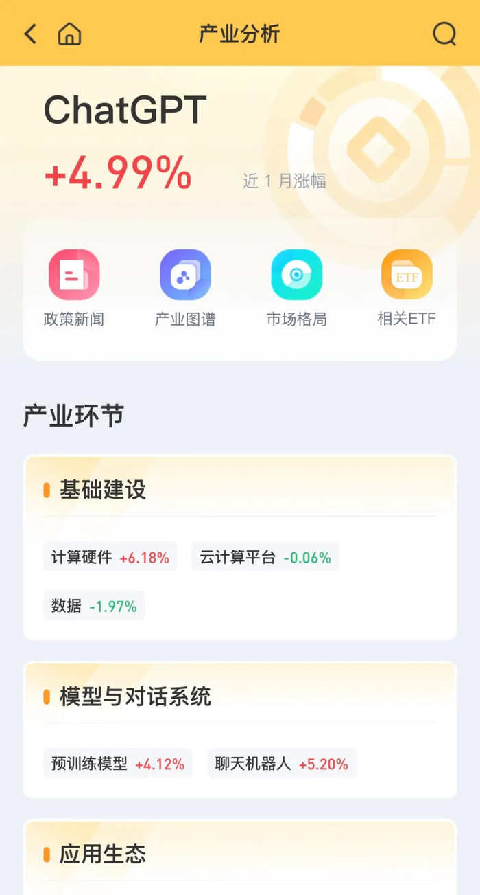 软件首页的【产业分析】模块,能看到当前市场上被重点关注的热门产业。点一下还能查看这个产业的详细信息:上下游、各个环节细分领域、每个领域内的代表公司、相关的ETF啊等等,真心方便。