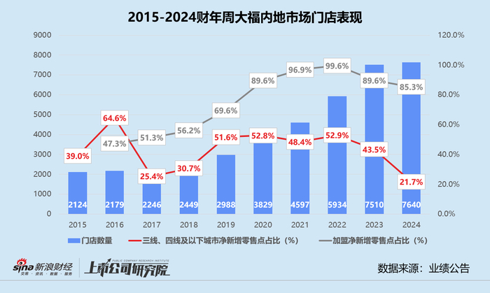 结合往期财报数据分析,2019-2023财年,周大福的内地珠宝零售点(不包括店中店和店内专柜)数量平均增速保持在25%左右,三线、四线及以下城市净新增零售点占比稳定在45%-50%之间,加盟模式净新增零售点约占90%。