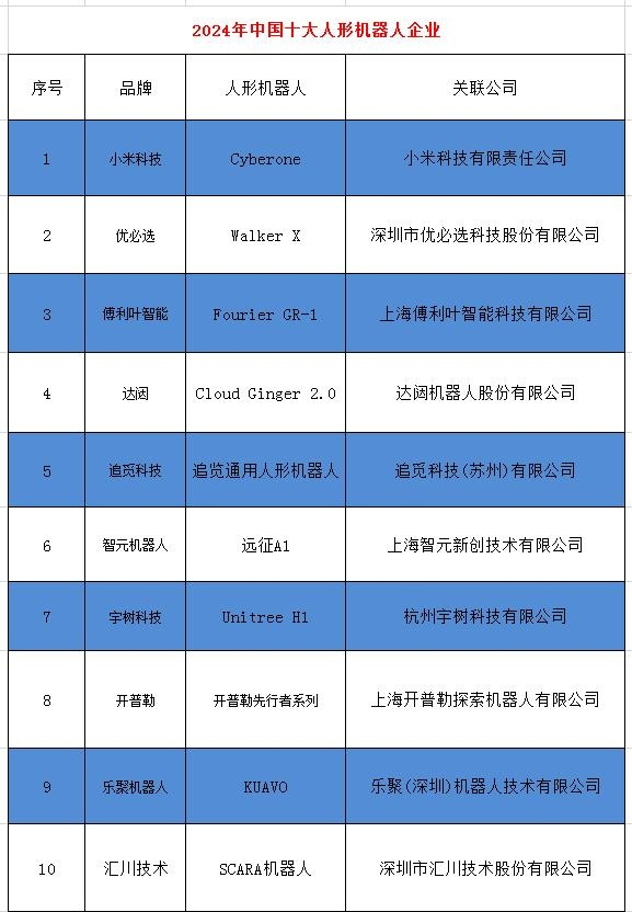 根据品牌信誉、知名度、销量、关注指数等维度,2024年中国十大最火人形机器人企业汇总如下(注:公司排名不分先后):