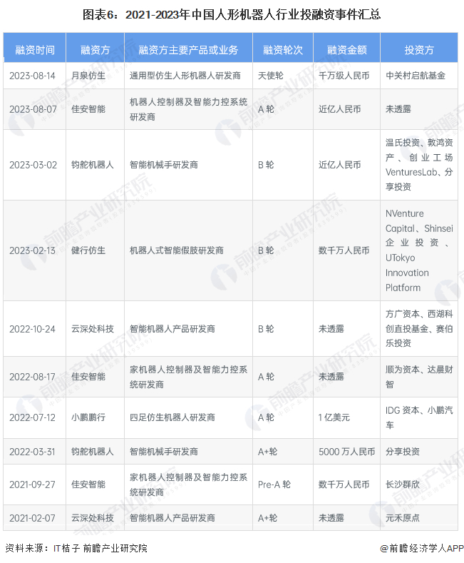 根据人形机器人行业公开披露的融资事件来看,A轮及以前的融资事件较多;2023年1-8月,有机器人零部件厂商如健行仿生、钧舵机器人、佳安智能获得融资,也有通用型人形机器人研发商月泉仿生获千万级人民币的天使轮融资。