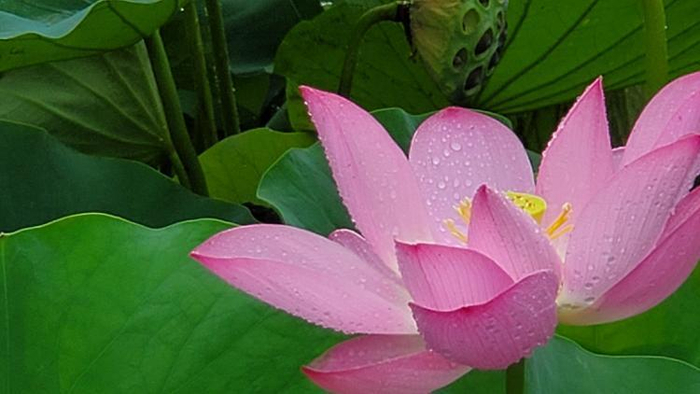 接天莲叶无穷碧,映日莲花别样红。除了同心公园,绿廊公园的荷花也如约开放。伴着蝉鸣声声,荷花迎着骄阳次第开放,粉红的花瓣一叶一叶肆意舒展着,偶尔有水珠悄悄爬上了圆润的荷叶,伴着微风在荷叶上悠哉悠哉地滚动着,似是在荡秋千一般。荷叶也不恼它,任它来回翻动,只是静静伫立在荷花一侧,远远看去,美不胜收。