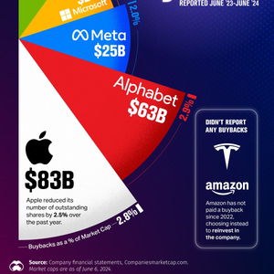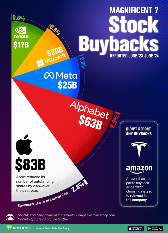 格隆汇6月19日|高盛预测,到2025年,美国股票的回购总额将超过1万亿美元,这一增长将由科技公司强劲的盈利增长和较低的利率所推动。根据各公司财务报告的数据,下图将“七巨头”自2023年6月1日至2024年6月1日期间的回购金额数可视化。期内,苹果“大手笔”回购了价值830亿美元的股票,为“七巨头”中最大规模回购。5月,苹果董事会批准新增1100亿美元的股票回购,为美国有史以来最大的股票回购计划。董事会表示,回购是基于“对苹果未来的信心,以及我们在苹果股票中看到的价值”。