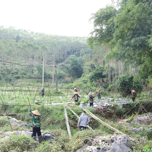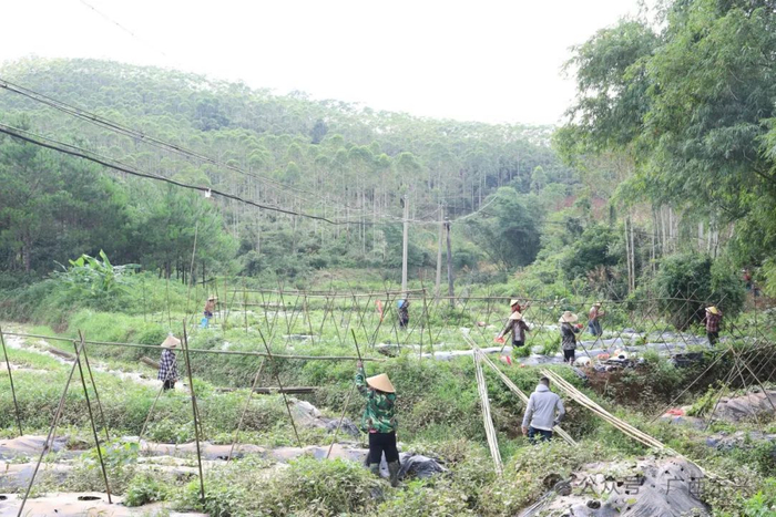 “村民正在百部基地立竹竿,预计立5万根竹竿左右,截至2024年5月,牛轭岭村中草药种植规模超千亩,累计联农带农收益超200万元,带动100多户本村及周边村民增收就业。”牛轭岭村党支部副书记林齐爵介绍说。