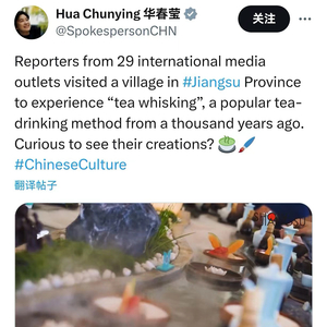 近日,中国外交部副部长华春莹在Twitter平台发布一则视频,视频展示了29家国际主流媒体的记者和专业摄影师走进江苏溧阳市天目湖镇桂林村,了解中国传统的点茶技艺,并品尝当地的特色茶饮。
