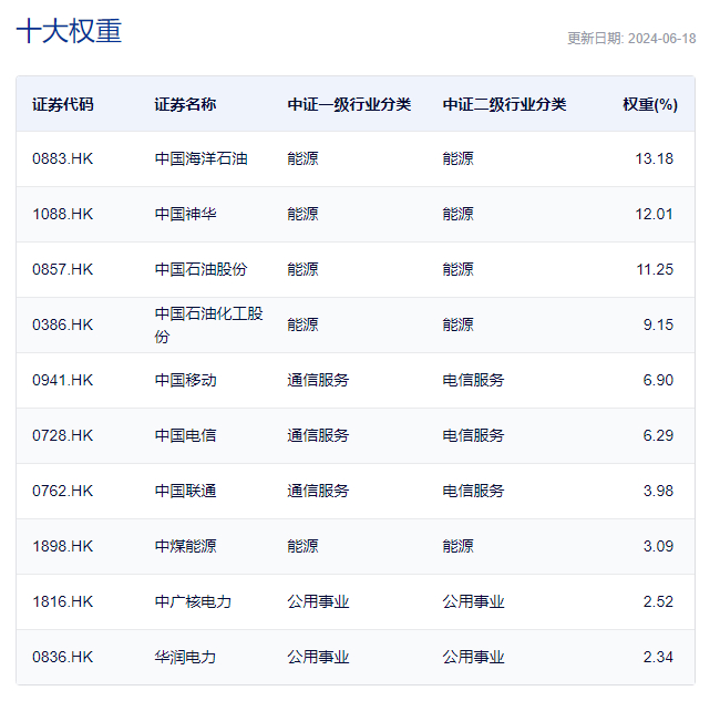 从行业分布和成份股来看,该指数一键配置了能源、通信服务、工业、公用事业、医药卫生等国民经济重要行业,成分股包括了中国海洋石油、中国神华、中国石油股份、中国石油化工股份、中国移动等龙头央企,反映了港股通范围内高股息率央企上市公司证券的整体表现,体现了在港上市央企的产业结构特点和长期投资价值。