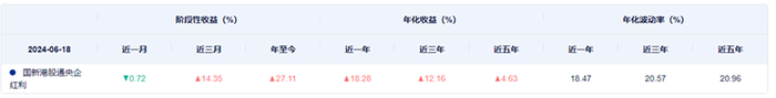 从编制方法来看,指数综合考虑了央企现金分红持续性和股息率,采用股息率调整后的自由流通市值加权,投资回报较为稳健,截至2024年截至6月18日,国新港股通央企红利指数近一月收益率-0.72%,近三月收益率14.35%,今年以来收益率27.11%,近三年12.16%。
