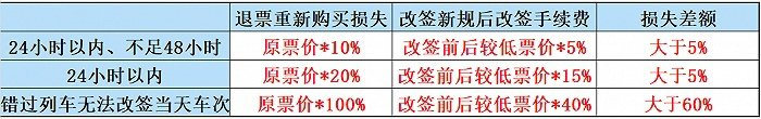 记者对比当前退票和改签规则发现,对于因故需改乘车日期之后列车的乘客来说,如果是48小时内乘客改签,将至少能减少5%的损失;如果是开车后当天乘客改签次日或之后车票,乘客将至少能减少60%的损失。