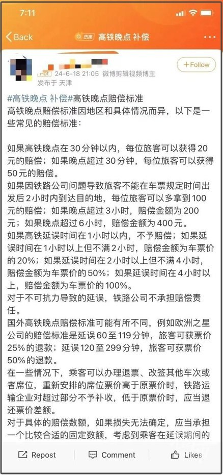 随后还有网友晒出“高铁晚点补偿标准”,引发讨论。