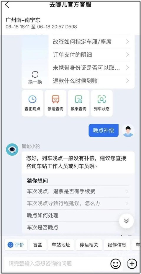 还有网友现身说法,咨询订票平台,AI助手表示没有晚点补偿。