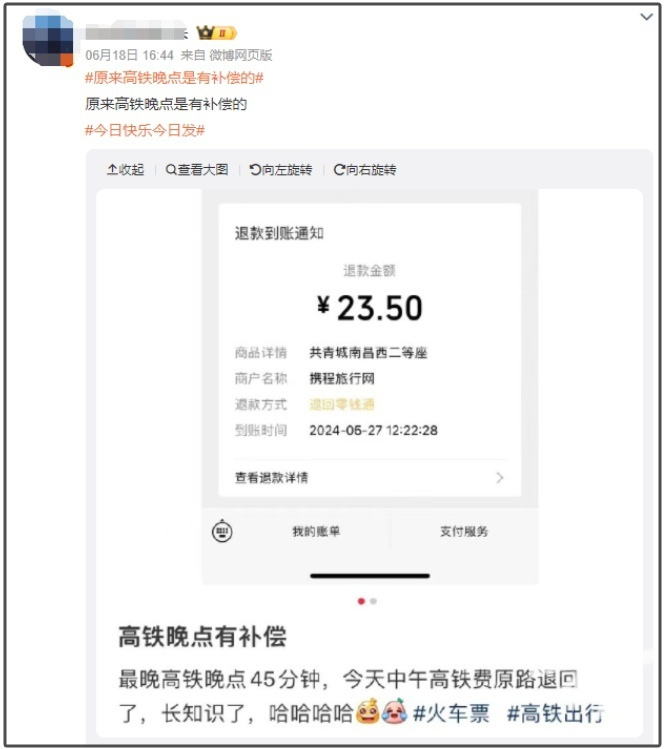 据该网友的帖子描述称,前一天高铁晚点了45分钟,次日就收到了第三方机构的23.5元退款。