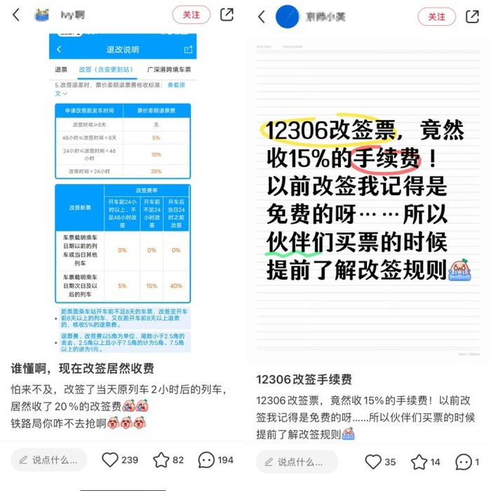 上个月,有乘客在社交平台上反映,在12306平台上改签车票时,发现需要扣除相应的改签手续费了。