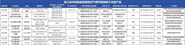 近期,浙江省市场监督管理局公布了全省50种流通领域产品质量监督抽查公告,其中涉及7批次房间空气调节器产品,具体情况如下。