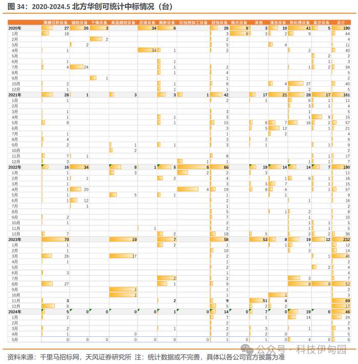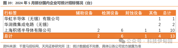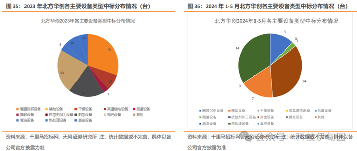 2024年5月,北方华创可统计中标设备6台,同比+50.00%,包括1台刻蚀设备,1台其他设备,4台热处理设备。