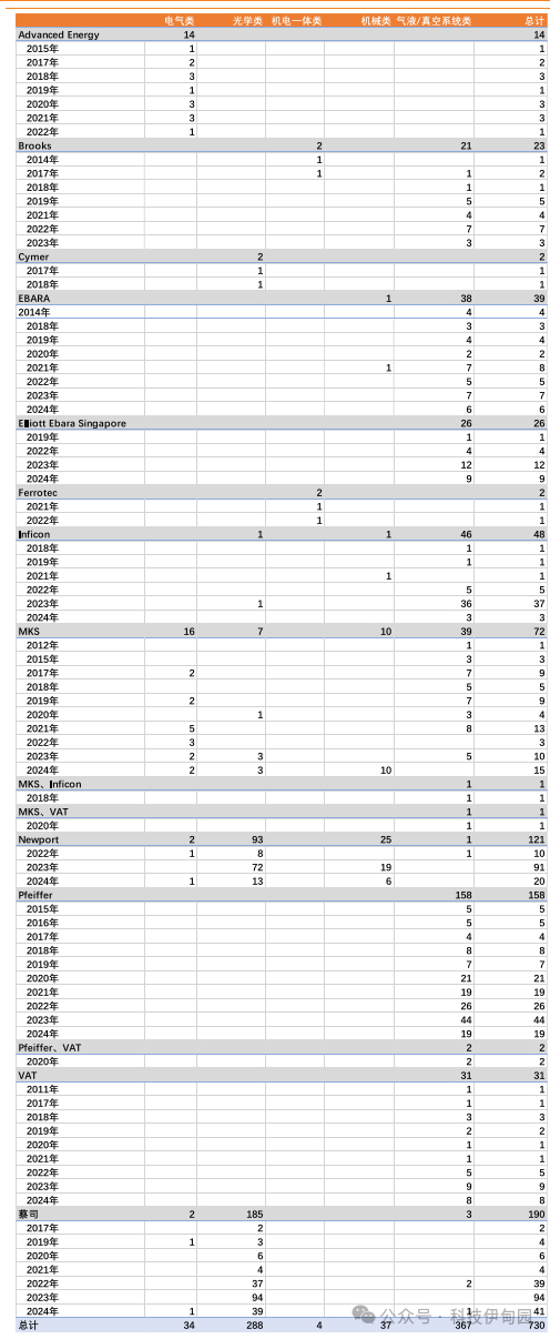 2024年5月,国外半导体零部件可统计中标共26项,同比+18.18%。主要为光学类11项,机械类2项,气液/真空系统类10项,电气类3项。分公司来看,Newport和蔡司可统计中标零部件最多,都为8项,Pfeiffer 3项,Elliott Ebara Singapore 4项,MKS 1项,VAT 2项。