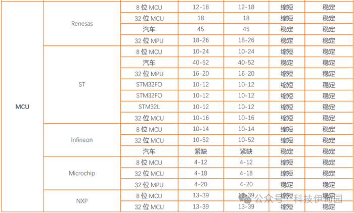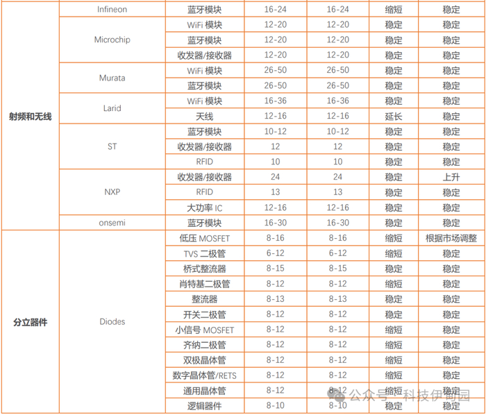 重点芯片供应商交期:从5月各供应商看,模拟芯片整体交期稳定,但PMIC等产品市场或将面临持续的价格压力;分立器件行情稳定,交期持续缩短;MCU价格分化,汽车MCU交期和价格持续改善;FPGA、射频行情稳定,存储价格持续小幅回升。