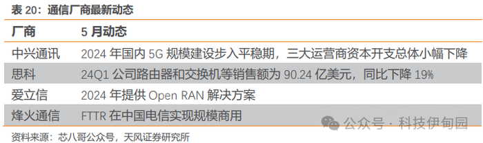 5月,国内通信设备需求持续放缓,终端厂商资本支出下降。