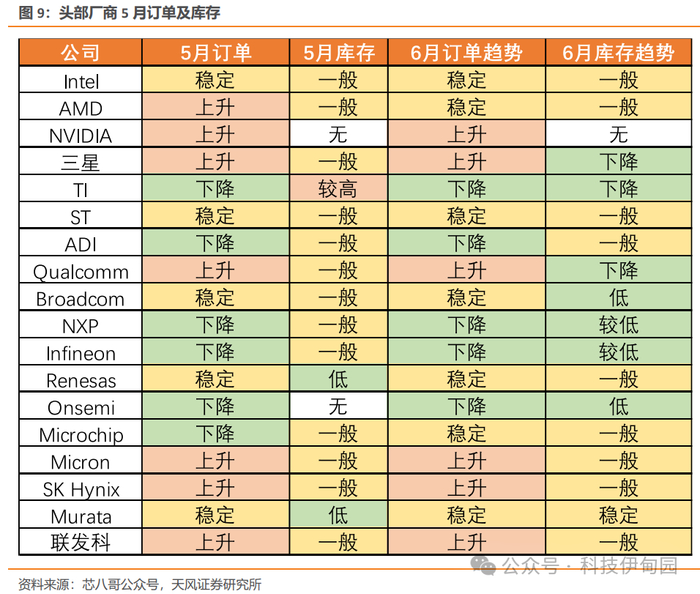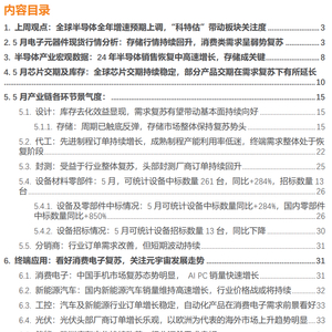 头部企业订单及库存情况:5月,消费类订单缓慢复苏;汽车库存有所上升,订单下降;工业及通信订单改善,但库存较高;新能源和AI相关需求维持高景气度。