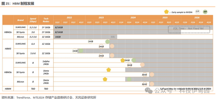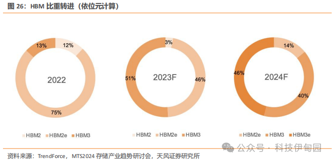 HBM迭代进程:2024年HBM2、HBM2e和3e的市场份额会发生比较明显的改变。 2023上半年主流还是HBM2e,但是因为H100的问世,下半年HBM3就成为市场主流,很快2024年就会进行到HBM3e,因为它堆叠的层数更高,所以平均单价一定要比现在再高20%-30%以上,所以它对产值的贡献会更明显。