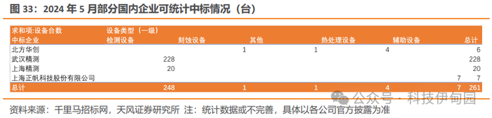 2024年5月可统计中标设备数量共计261台,同比+283.82%。其中辅助设备1台,检测设备248台,刻蚀设备1台,其他设备1台,热处理设备4台。
