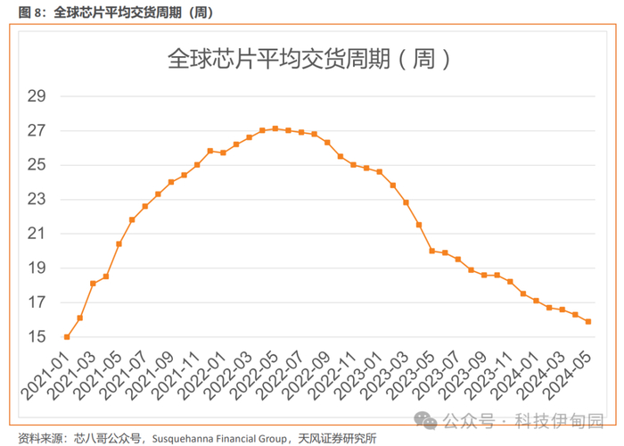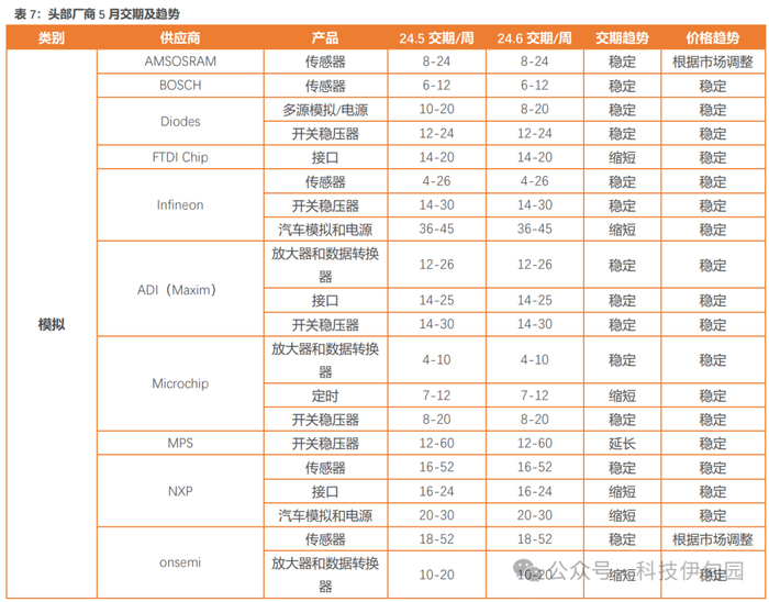 整体芯片交期趋势:5月,全球芯片交期持续稳定,部分产品交期在需求复苏下有所延长。