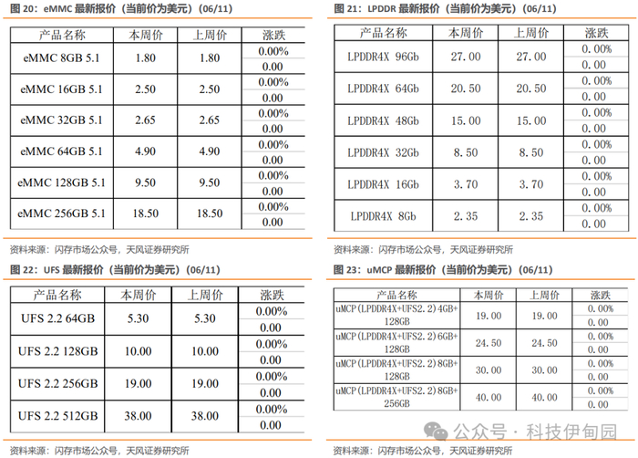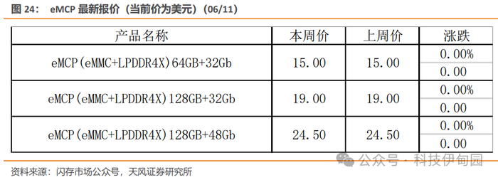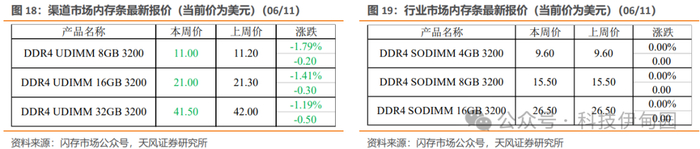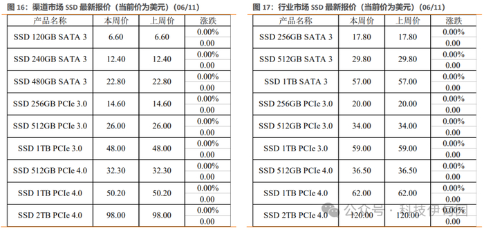 根据闪存市场公众号对存储行情的周度(截至 2024.06.11)评述,本周上游资源方面,近期NAND Flash wafer和DDR颗粒价格小幅下调。渠道市场方面,存储现货渠道市场需求寡淡,竞价出货以达降低库存水位。本周渠道内存条价格全面下调,渠道SSD整体价格暂时持平不变,部分渠道品牌SSD价格有一定的下滑,短期渠道行情仍不明朗。行业市场方面,存储行业市场方面,因终端厂商原本就拥有一定的库存,上游资源价格仍居高位,采购端还是遵循按需拿货策略,本周行业SSD和内存价格维持不变。嵌入式市场方面,现货嵌入式市场方面,本周嵌入式产品整体价格维持不变,现货市场观望气氛依然浓厚。