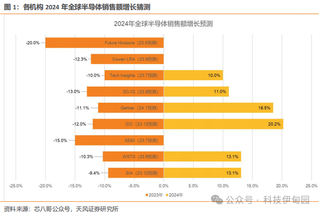 从全球半导体销售额看,2023年半导体行业筑底已基本完成,从Q3厂商连续数月的稳定增长或奠定半导体行业触底回升的基础。全球部分主流机构/协会上修2024年全球半导体销售额预测,2024年芯片行业将出现10%-18.5%之间的两位数百分比增长。其中,IDC和Gartner最为乐观,分别预测增长达20.2%和18.5%。