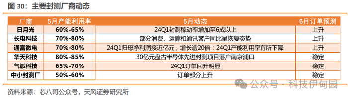 5月,受益于行业整体复苏,头部封测厂商订单持续回升。日月光预计24Q1封测稼动率增加至6成以上。长电科技5月产能利用率约70-80%,部分消费、运算和通讯客户同比呈恢复态势。通富微电5月产能利用率达70-80%,24Q1归母净利润接近亿元,增长逾20倍;24Q1产能利用率有所下降。华天科技5月产能利用率达到80%-85%。