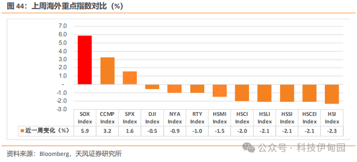 上周(06/08-06/15)海外各重点指数绝大部分下跌,费城半导体指数领涨。其中SOX Index涨幅最大为5.9%,HSI Index跌幅最大为2.3%。费城半导体指数涨幅为5.9%,表现在海外各重点指数中最优。