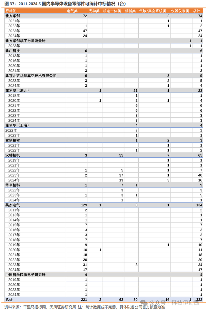 2024年5月,国内半导体零部件可统计中标共19项,同比+850%。主要为机械类1项,为菲利华(湖北)中标,电气类11项,为北方华创、英杰电气、中国科学院微电子研究所中标,机电一体化类6项,为汉钟精机中标,气液/真空系统类1项,为汉钟精机中标。